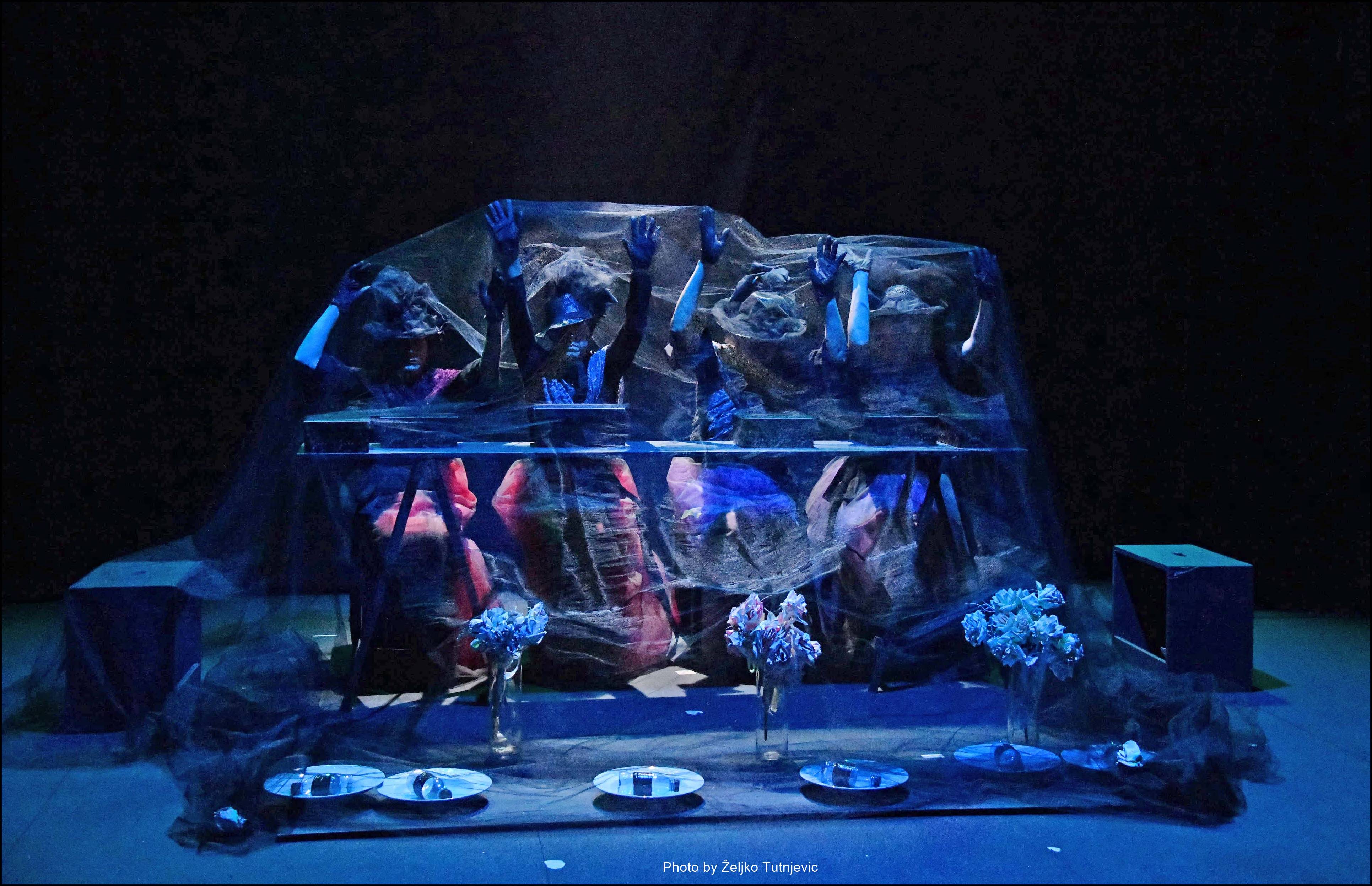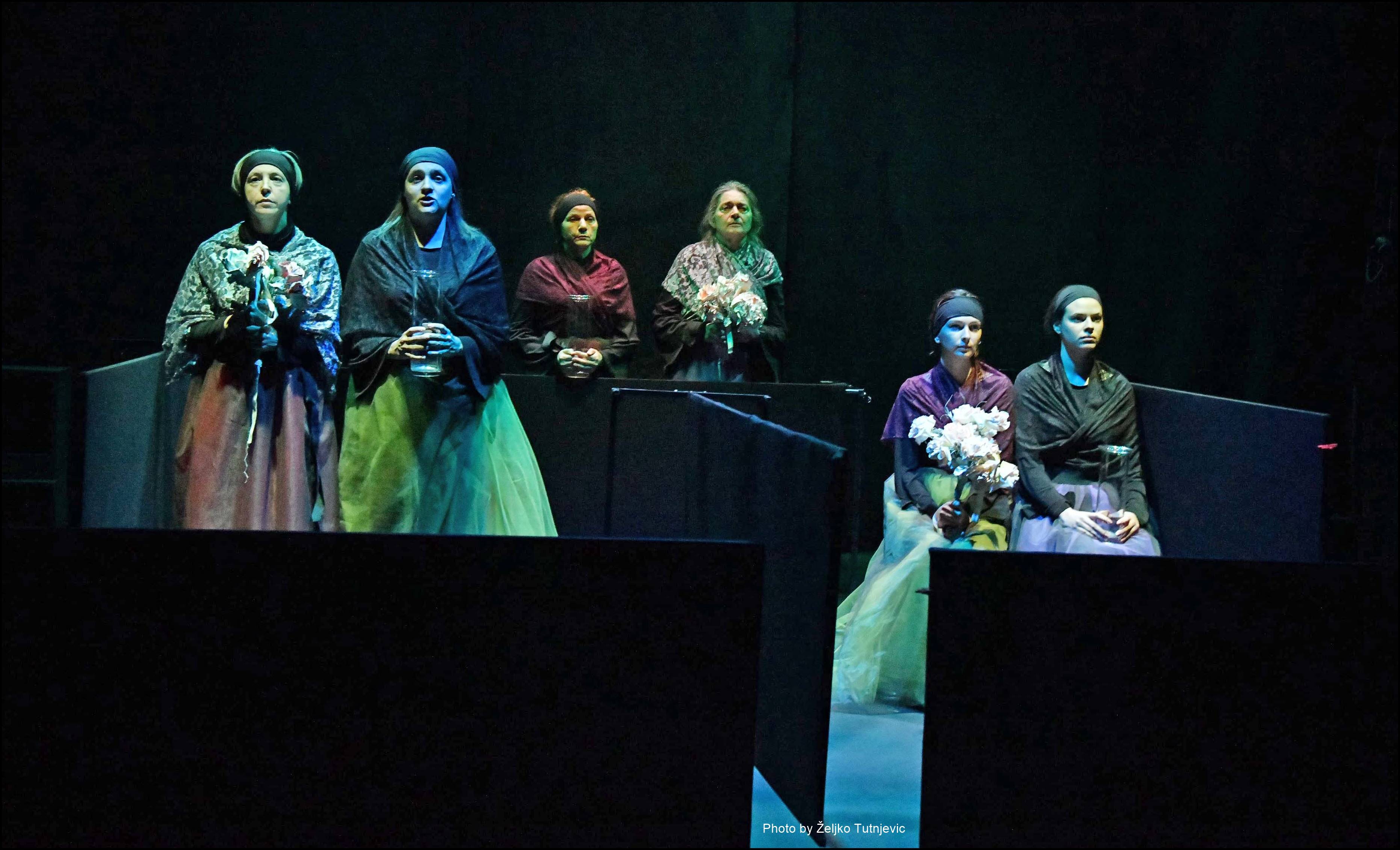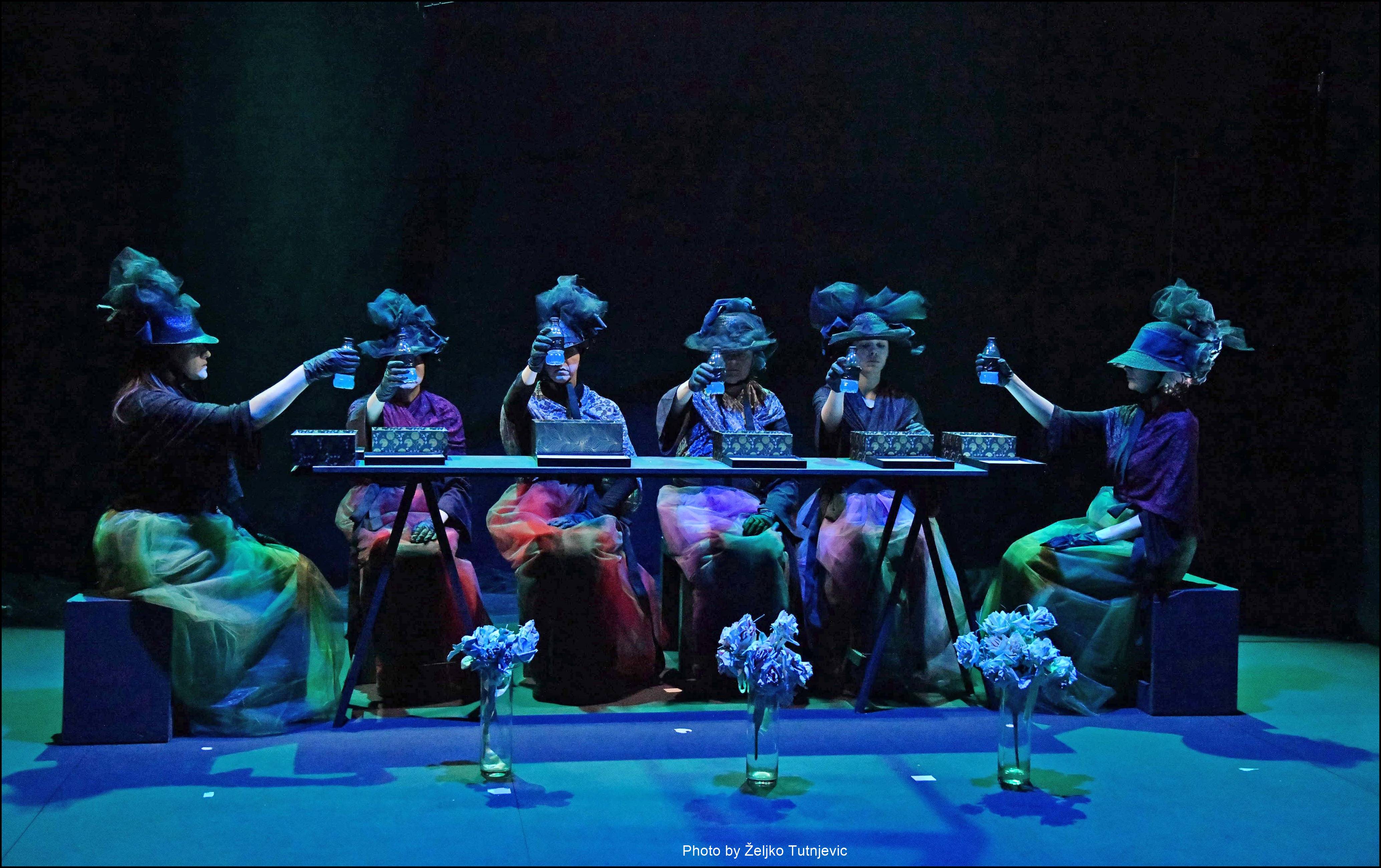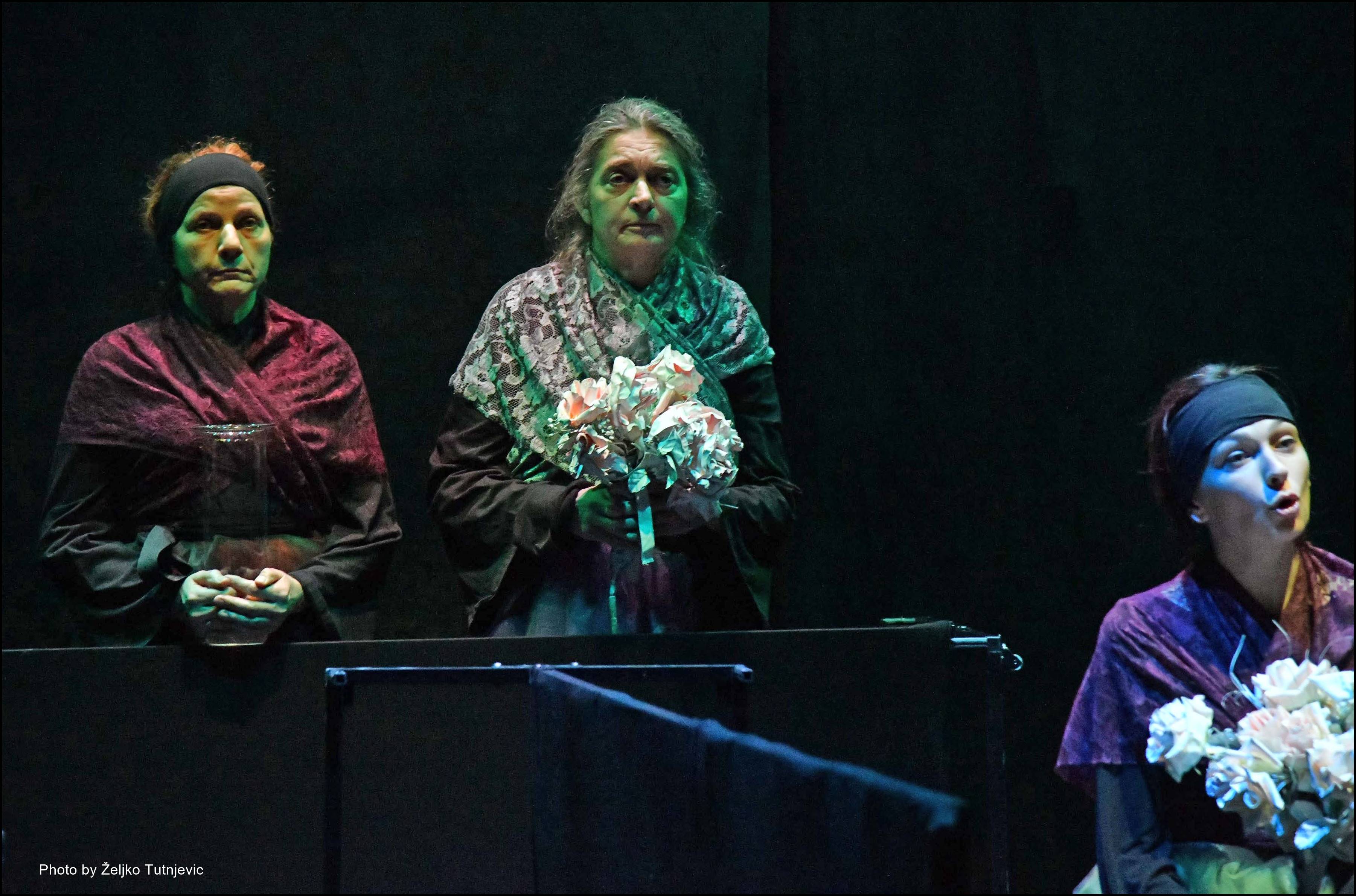 Neki elementi predstave: Doći – Proći, S. Beckett / Udovice, S. Mrożek (fragment) / Gospođe, D. Mojaš (fragment) / Slučajevi, D.Harms (fragment) / Cvijetni buketi iz Kaplji, golubovi iz Mjesečine za Lady Macbeth, vjetrovi iz Juga i utihe iz spomenara Grada sjena….